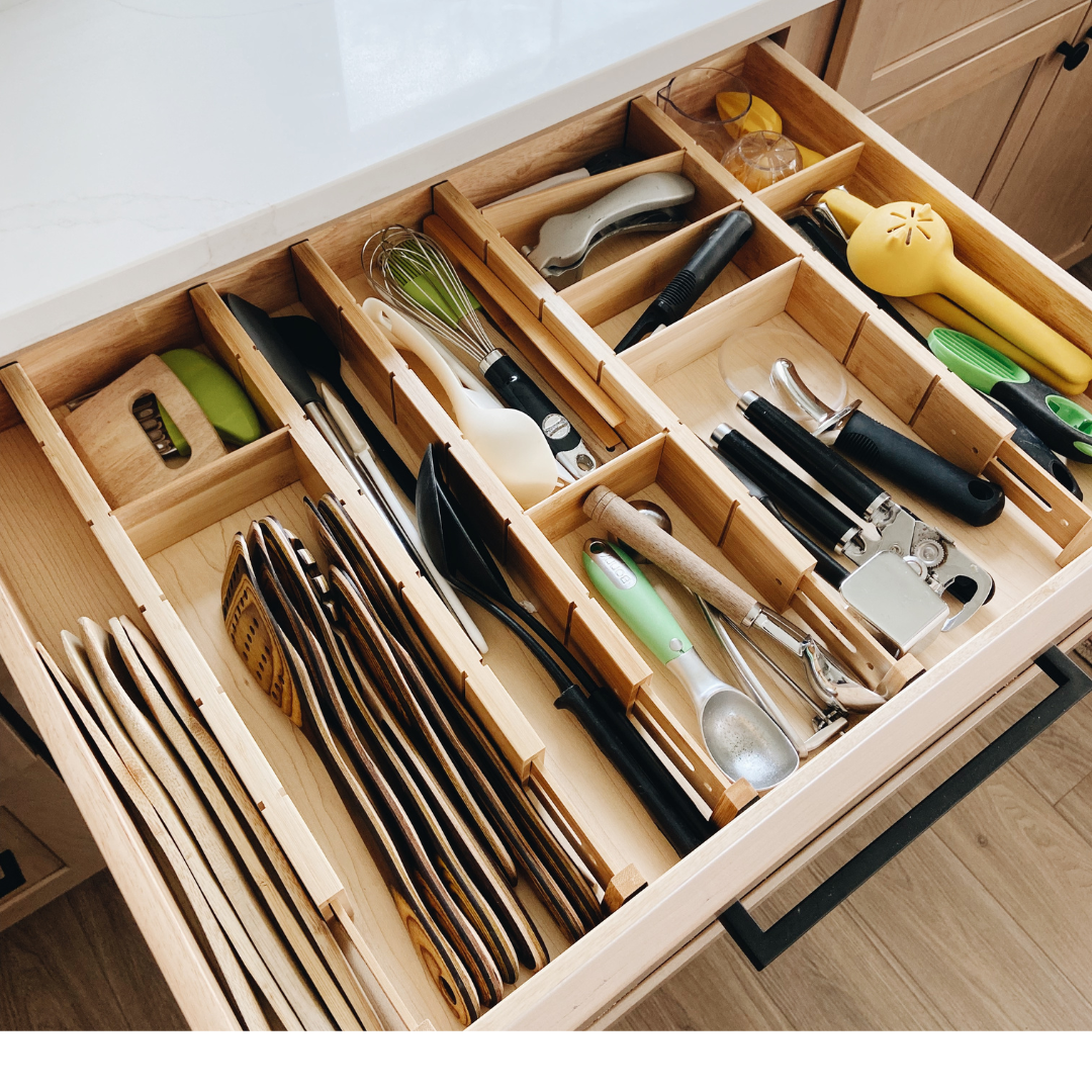 The SpaceAid Bamboo Drawer Dividers + inserts come in two different lengths (13-17" and 17-22"), so measuring the depth of your drawer first is essential. If your kitchen drawer is extra wide, I recommend the SpaceAid Bamboo Divider with 7 dividers (versus 4). The appeal of this product is that it is entirely customizable. No need to spend tons of money buying individual drawer organizers, trying to Tetris a solution inside a drawer still to have nothing fit quite right. With the Space Aid Drawer Dividers, you can use the dividers to corral longer items like spatulas, stirring spoons, and tongs. For smaller kitchen gadgets like potato peelers, can openers, and meat thermometers- use the short or long inserts with the product to create individual slots for these items. Creating proper spacing for your kitchen gadgets may still take trial and error. The pictures below provide some inspiration!